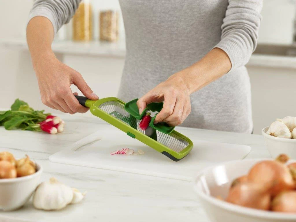 This handy gadget helps to create even slices of fruit or vegetables quickly and easily, whilst keeping your fingers safely away from its sharp stainless-steel blade.