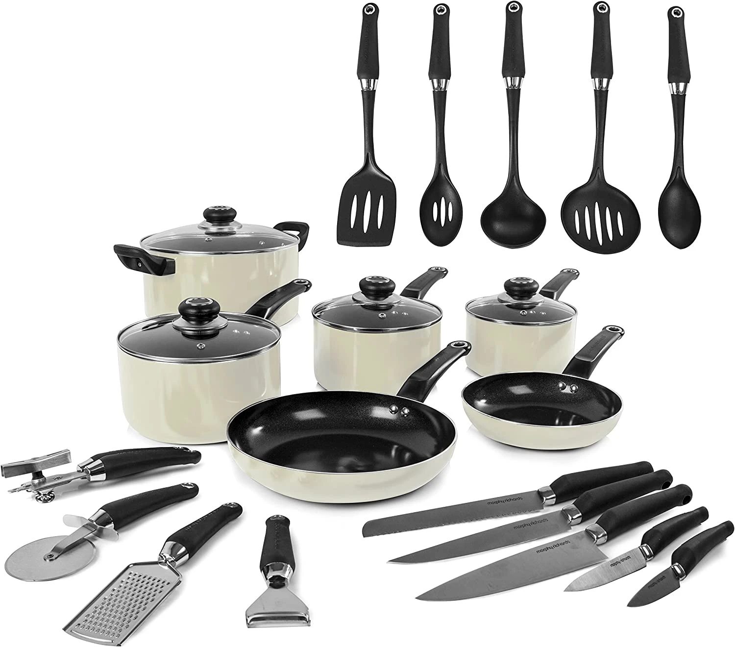 The pans are suitable for all hob types excluding induction. The included 9 Piece Tool Set consists of slotted and solid spoons, slotted turner, skimmer, ladle, peeler, grater, pizza cutter and can opener.