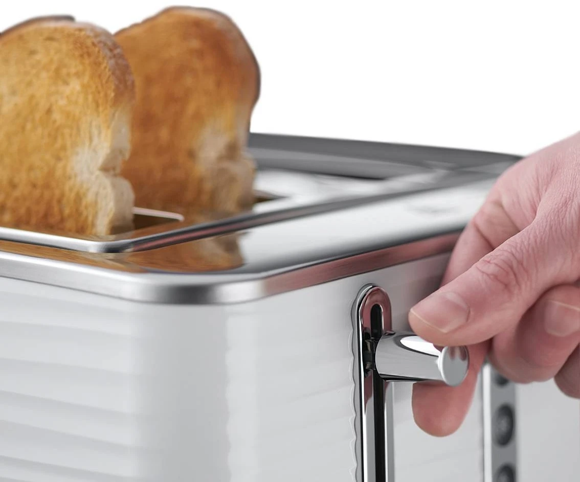 Toast up to 4 slices of bread at one time with this stylish and efficient toaster. Variable browning control lets you toast your bread exactly the way you like it, while cancel and re-heat functions give you full control over the toasting cycle. The toaster also boasts a defrost function, which lets you toast your bread directly from the freezer. The toaster is complete with a removable crumb tray, for easy cleaning, variable width slots, to fit all different types of bread, and a high-lift function, which gives you easy access to your bread once it is done toasting.